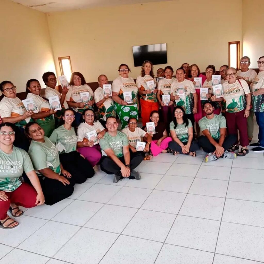 Para finalizar, foi realizada a entrega do livro de receitas, elaborado a partir das receitas descritas pelas próprias participantes do grupo, simbolizando a valorização dos saberes culinários e da cultura local.
