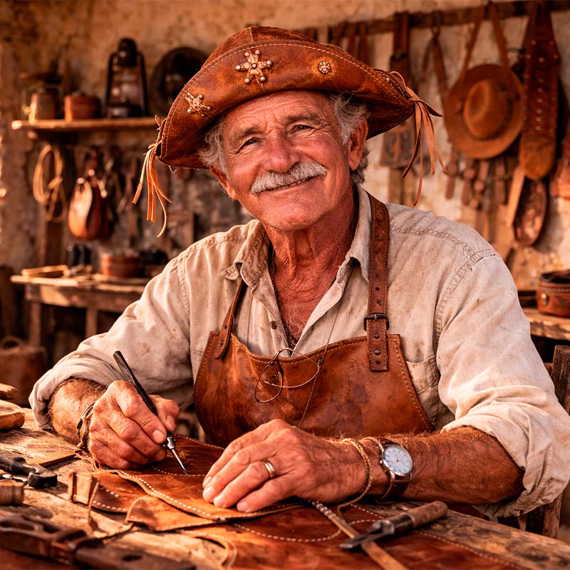 Chapéu produzido artesanalmente em couro legítimo, com costuras reforçadas e acabamento rústico que valoriza a tradição nordestina. Resistente, confortável e cheio de identidade, é ideal para quem aprecia peças autênticas feitas à mão.