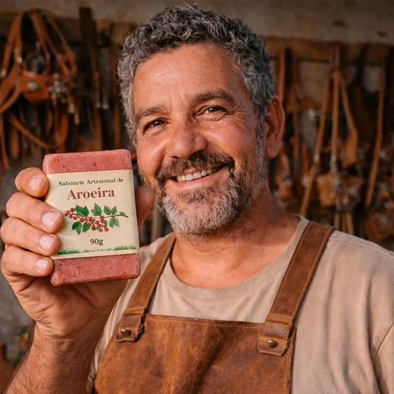 Sabonete natural produzido com extrato de aroeira. Tradicionalmente utilizado para cuidados com a pele, aliado a óleos vegetais e produção artesanal.